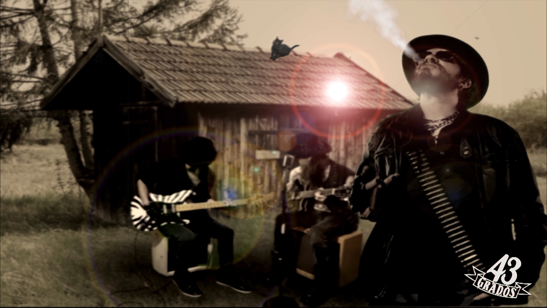 BluesEsclavo foto 3 Publicado el julio 20, 2025 a 1920 × 1080 en Estreno del videoclip «El Blues del Esclavo», de 43 GRADOS Fotograma del videoclip El Blues del Esclavo, de la banda de Hard Rock 43 GRADOS. Ace y Johnny (fondo) junto a Kross Karver